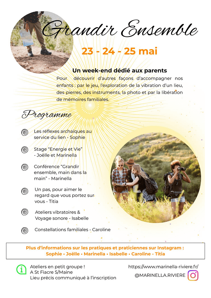 Dans le cadre du week-end « Grandir ensemble », organisé par Marinella Rivière, je vous invite à découvrir comment les réflexes archaïques peuvent devenir un outil précieux pour cultiver le lien avec votre enfant. Cet atelier, à la fois théorique et pratique, vous permettra de mieux comprendre le développement de votre enfant et d’expérimenter des mouvements accessibles pour l’accompagner au quotidien.
